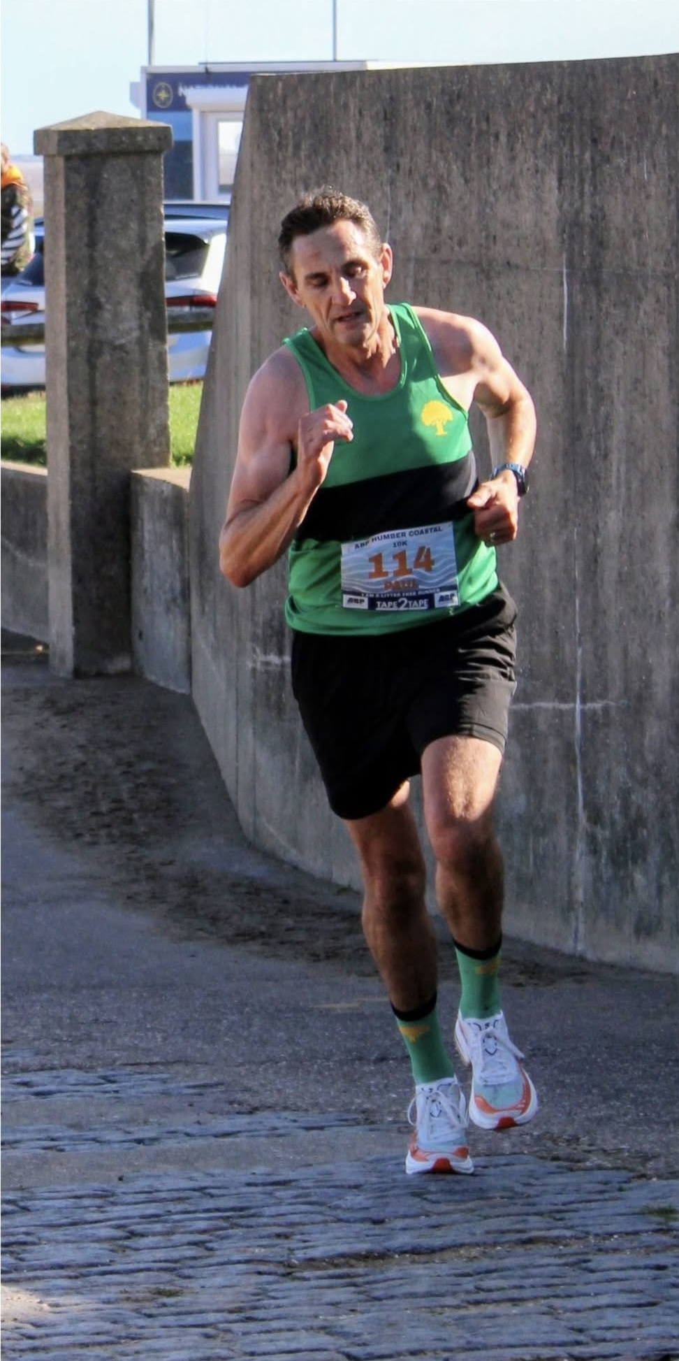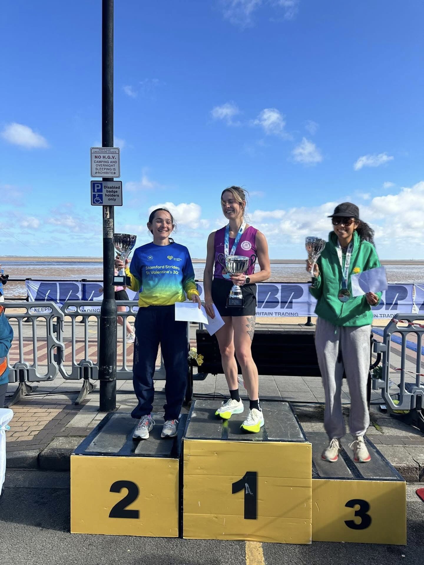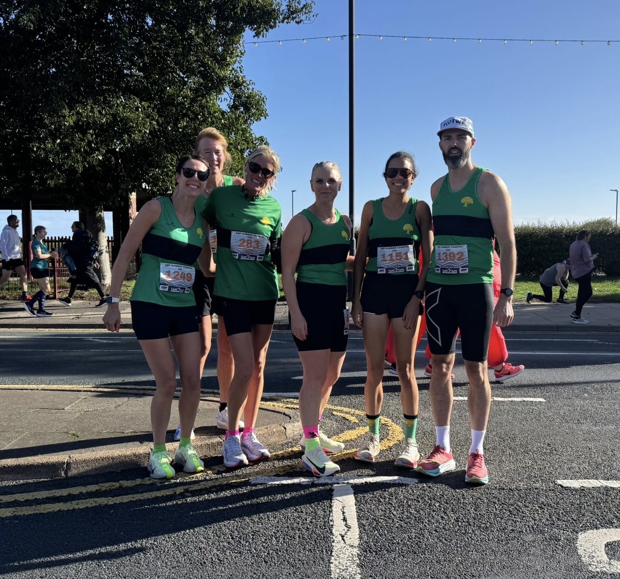 Off the Track and out to the coast as the Harriers headed East to the Humber Coastal 10k for a GP race and some prize winning performances. Thankfully the projected heavy rainstorm passed early but runners were still left battling a significant headwind in the latter half as the runners headed South from Cleethorpes before looping around on to the flat but exposed coastal path for a battle down the last 4km in to the wind. A battle was no less than we got either as leading the Harriers Ladies home as well as bagging a spot on the podium and a PB of nearly 3 minutes, Hannah Miller was part of a trio of ladies battling out an exciting finale over the last 2km as she finished 3rd in a time of 38:32 with all three podiums finishing within a 9 second window. The first of what was an excellent day for our ladies as Claire Allsop also knocked minutes of her PB to run 46:32 (closing in on a silver standard), Lucy Binch ran a composed 49:18 as part of her long run and marathon training followed by another big PB and club standard from Nia Arthur in 50:49. Rachel Silcock made a welcome return to the squad in 54:11 whilst an East Coast Regular Carolyn Luckham finished the ladies team in 1:10:34.